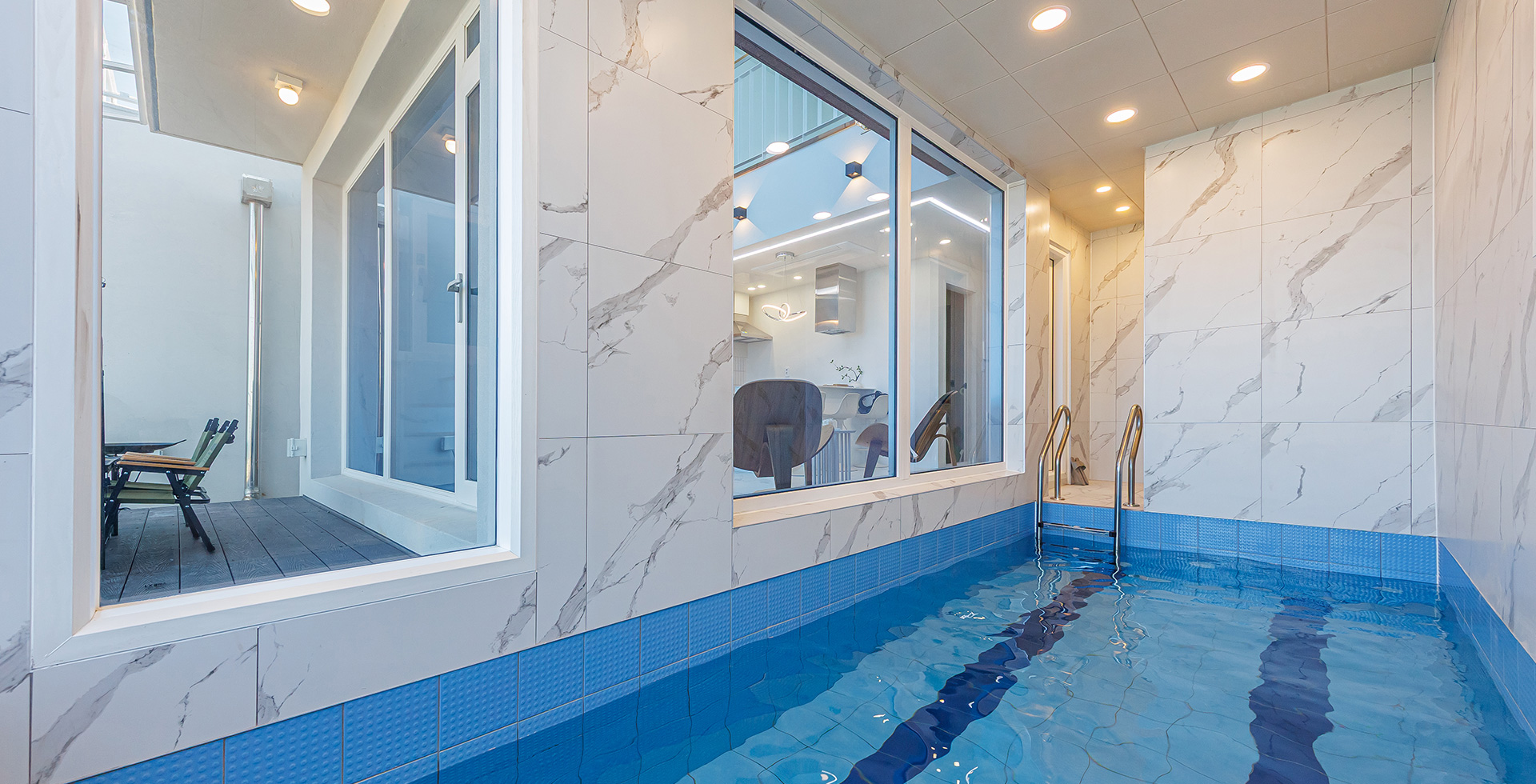 1층: 개별수영장 + 원룸형 거실/주방 + 테라스(바비큐) + 화장실